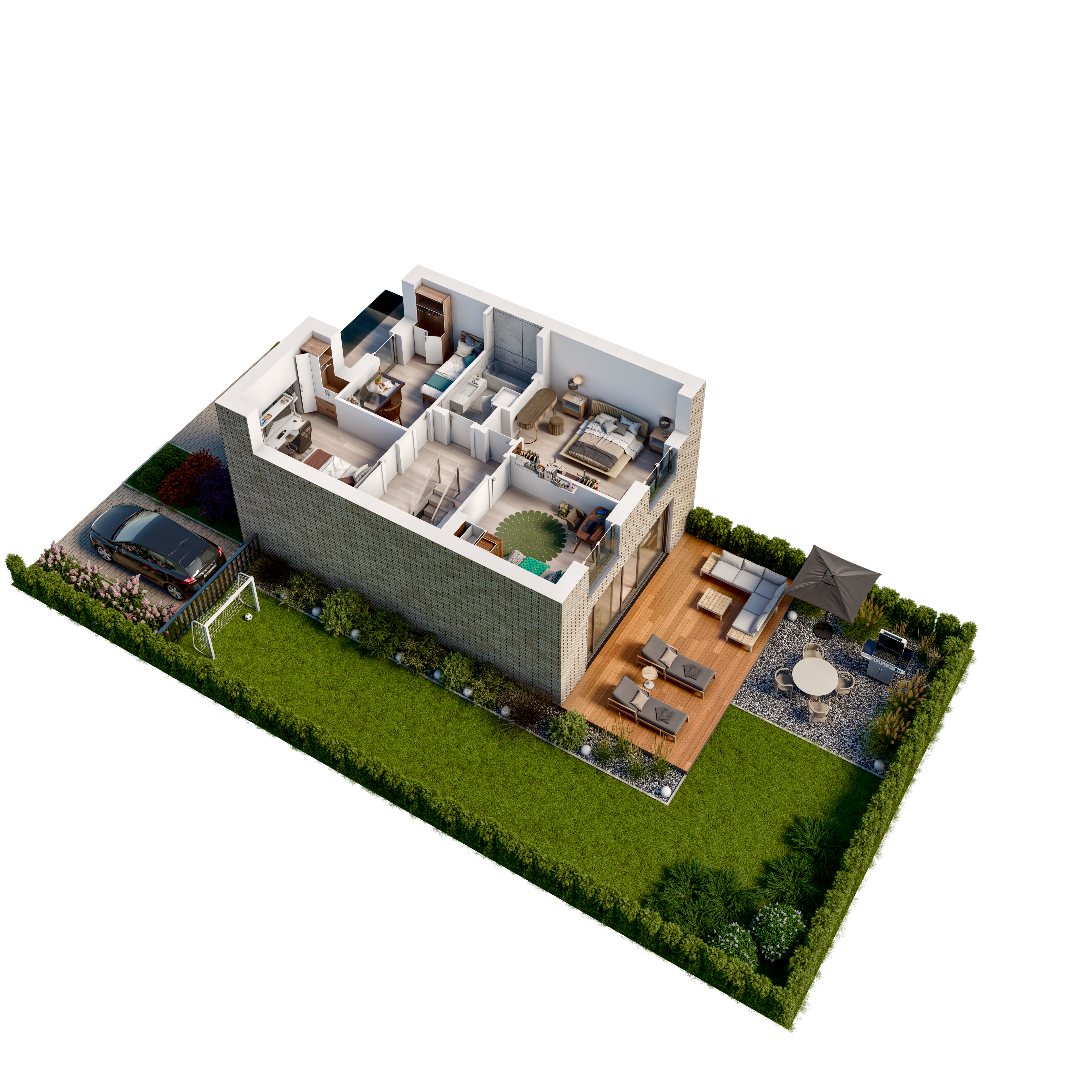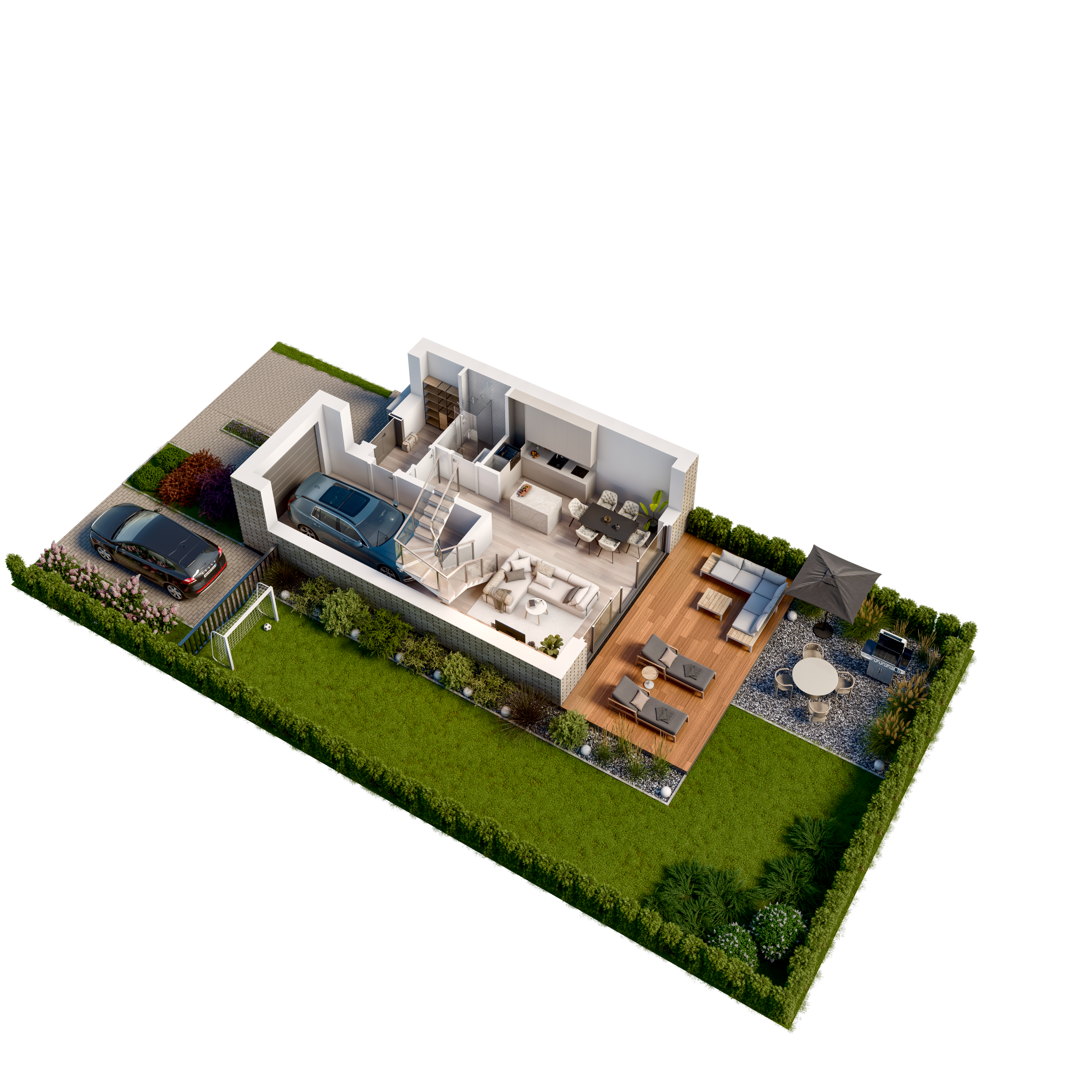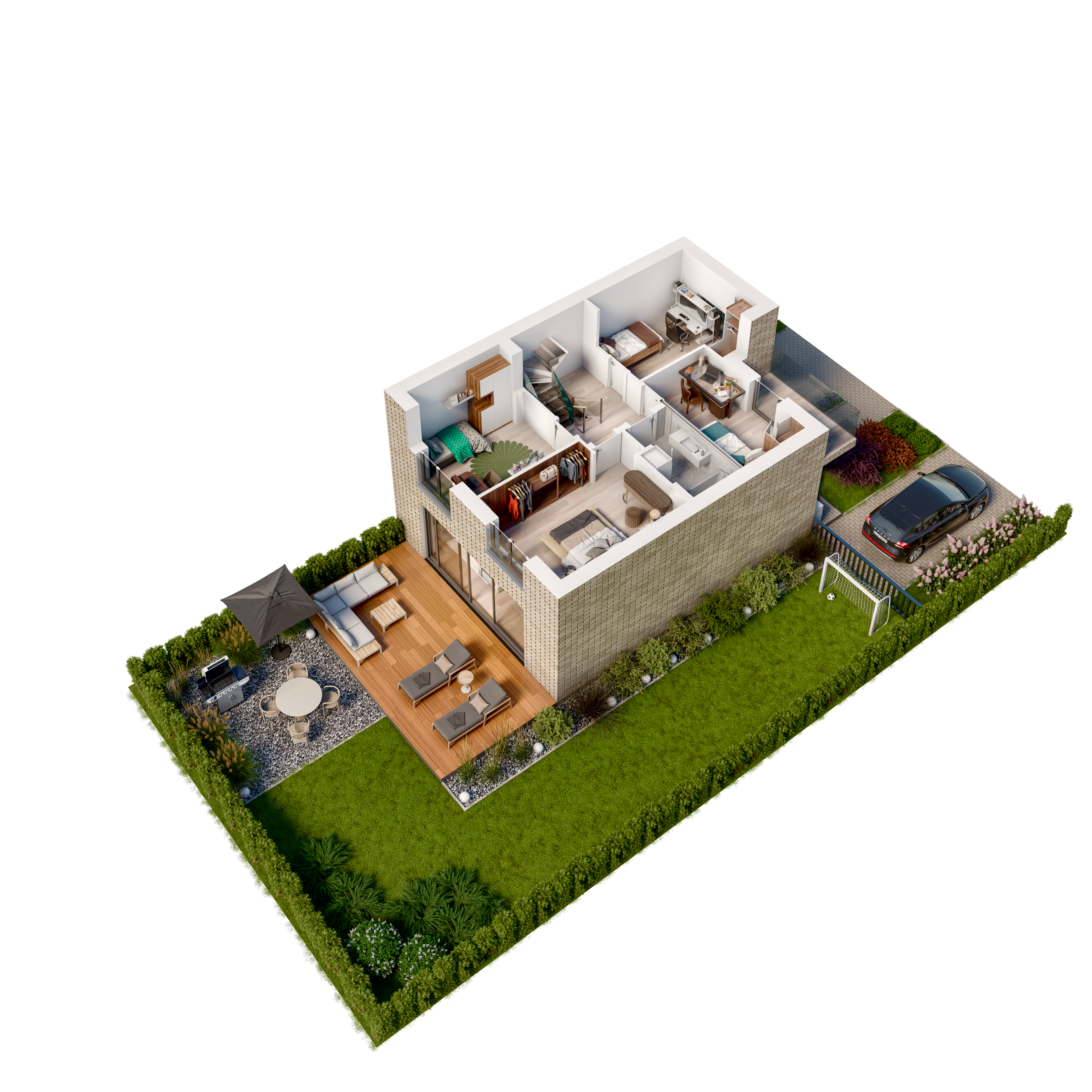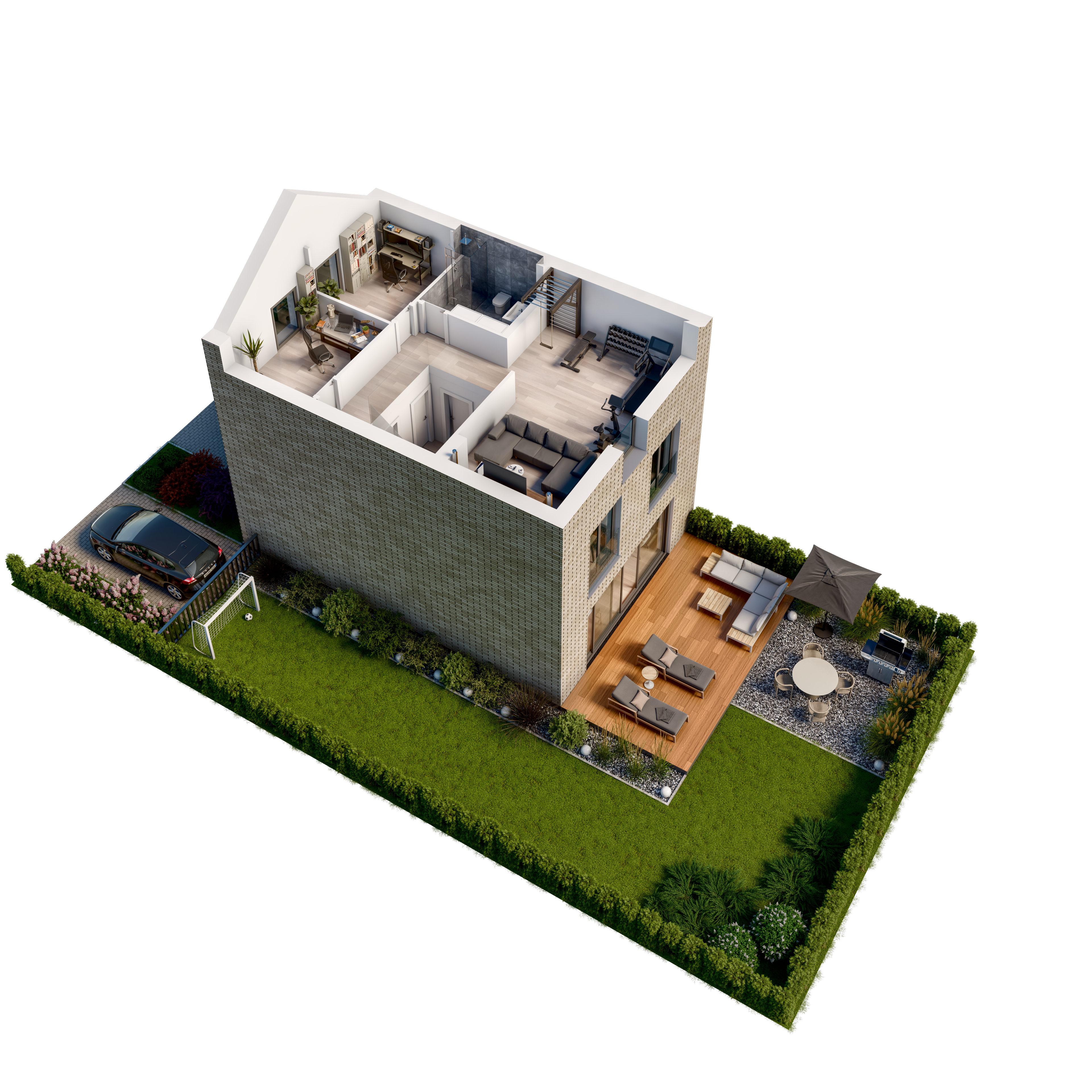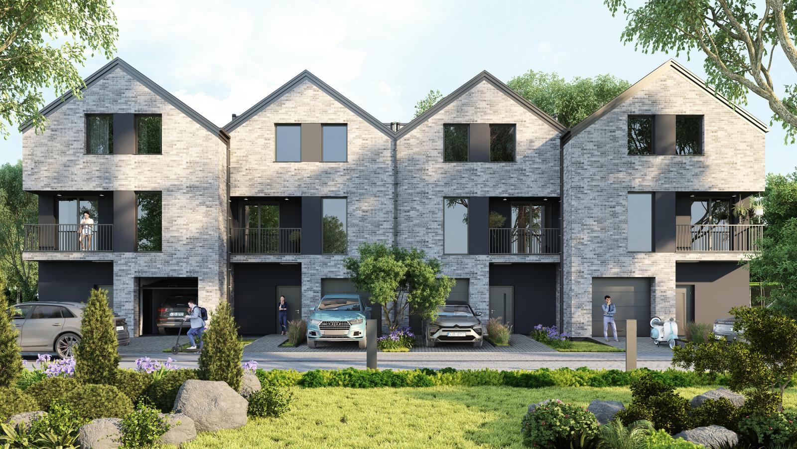 Każdy z trzykondygnacyjnych domów posiada m.in garaż, strefą dzienną o zróżnicowanym nasłonecznieniu, pięknie zaaranżowany ogród.