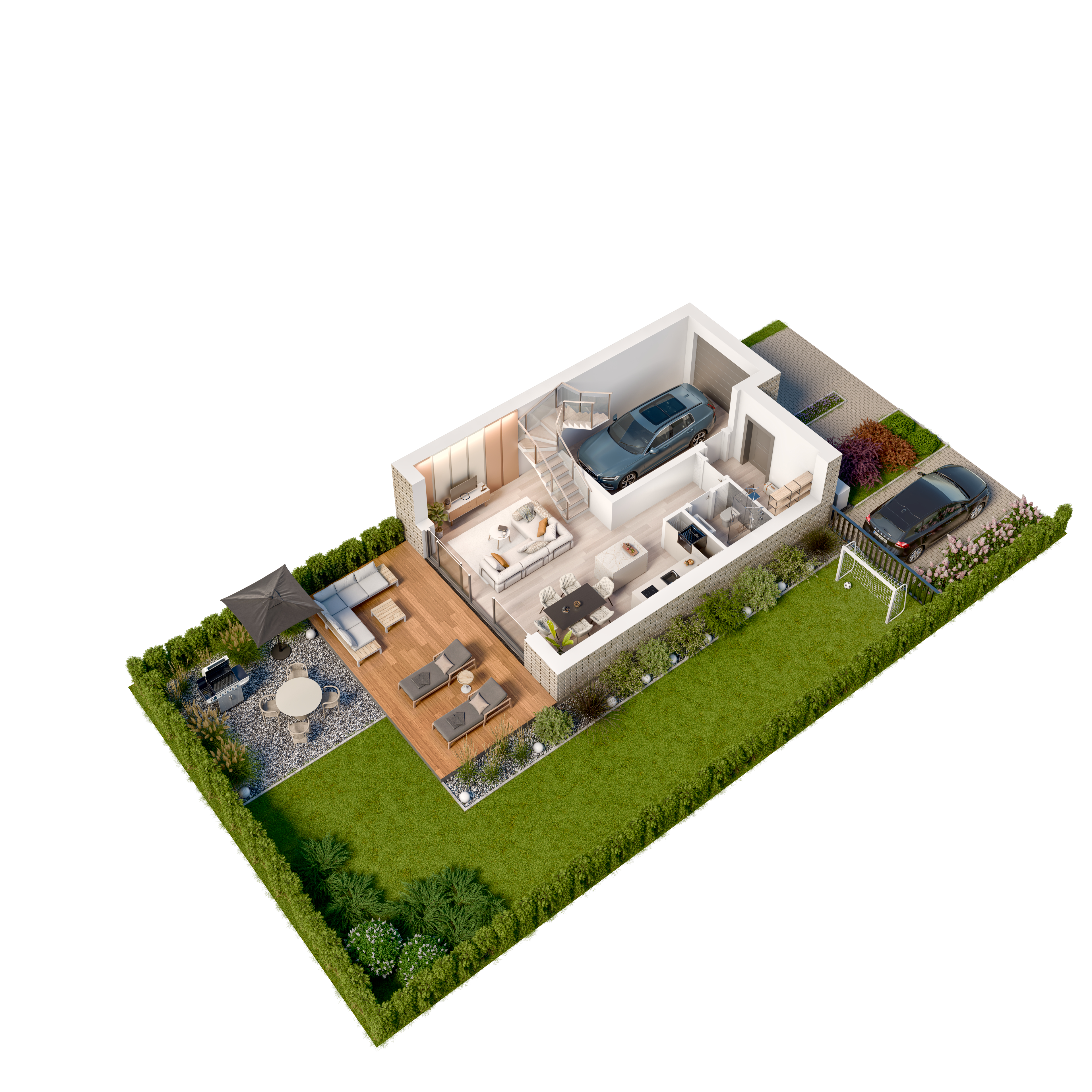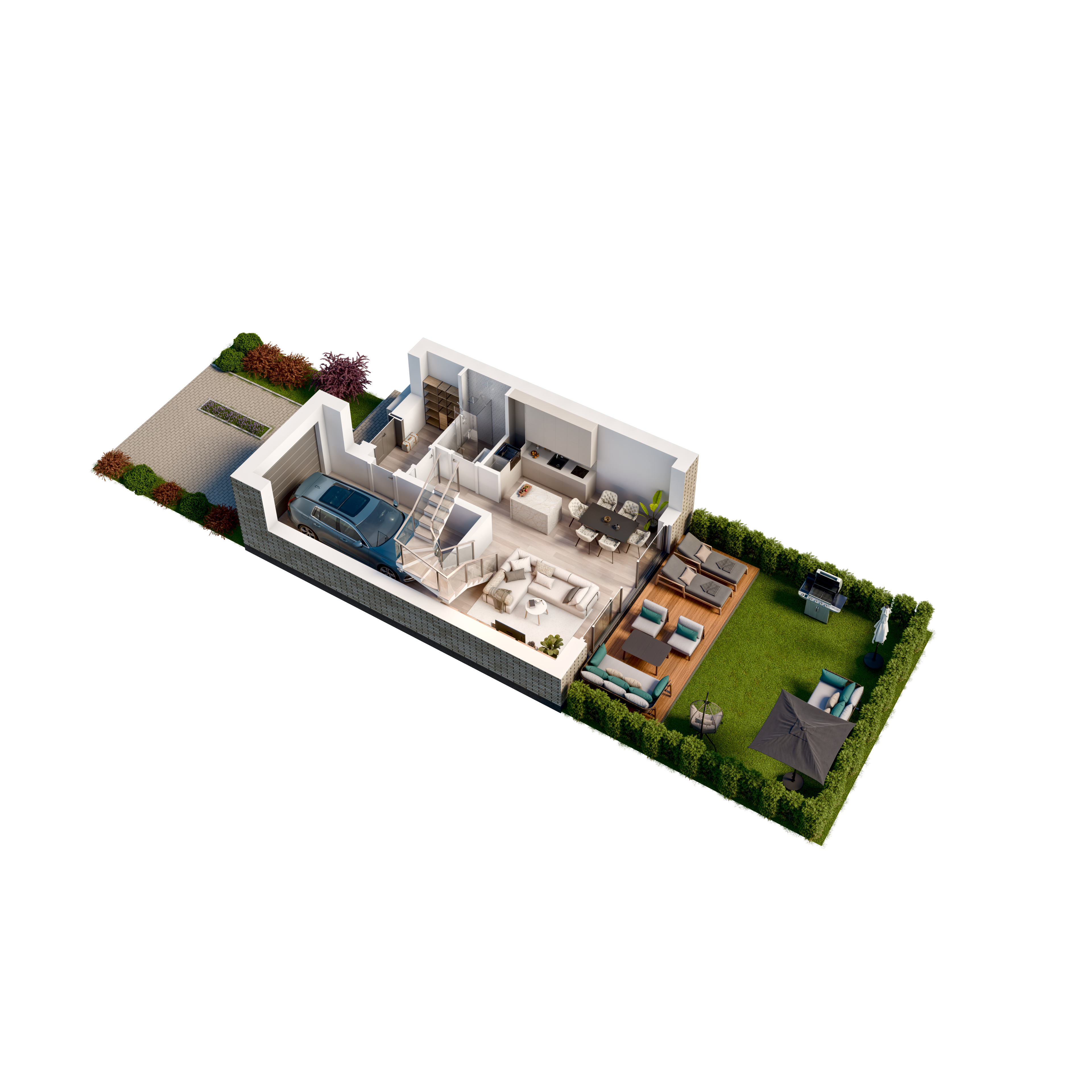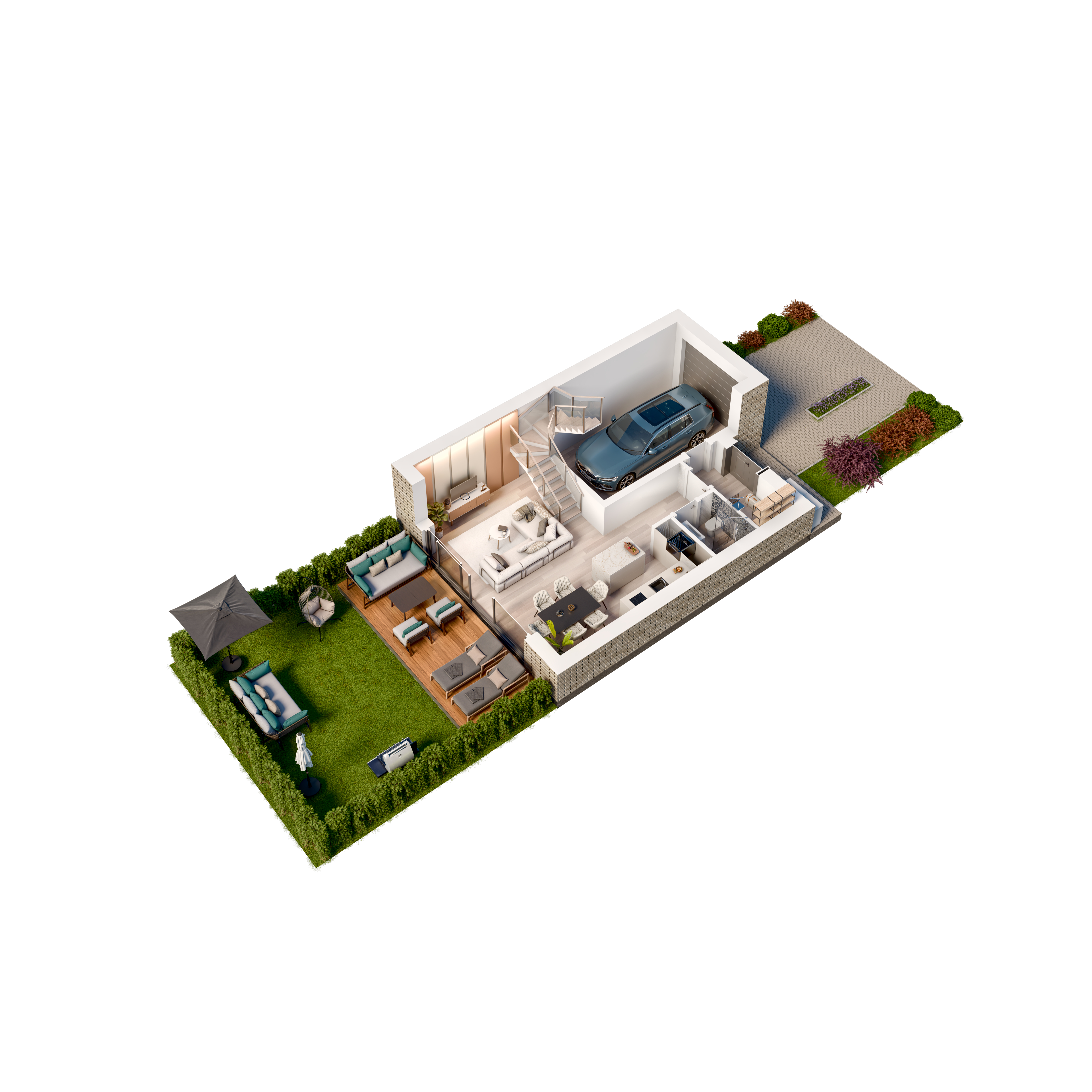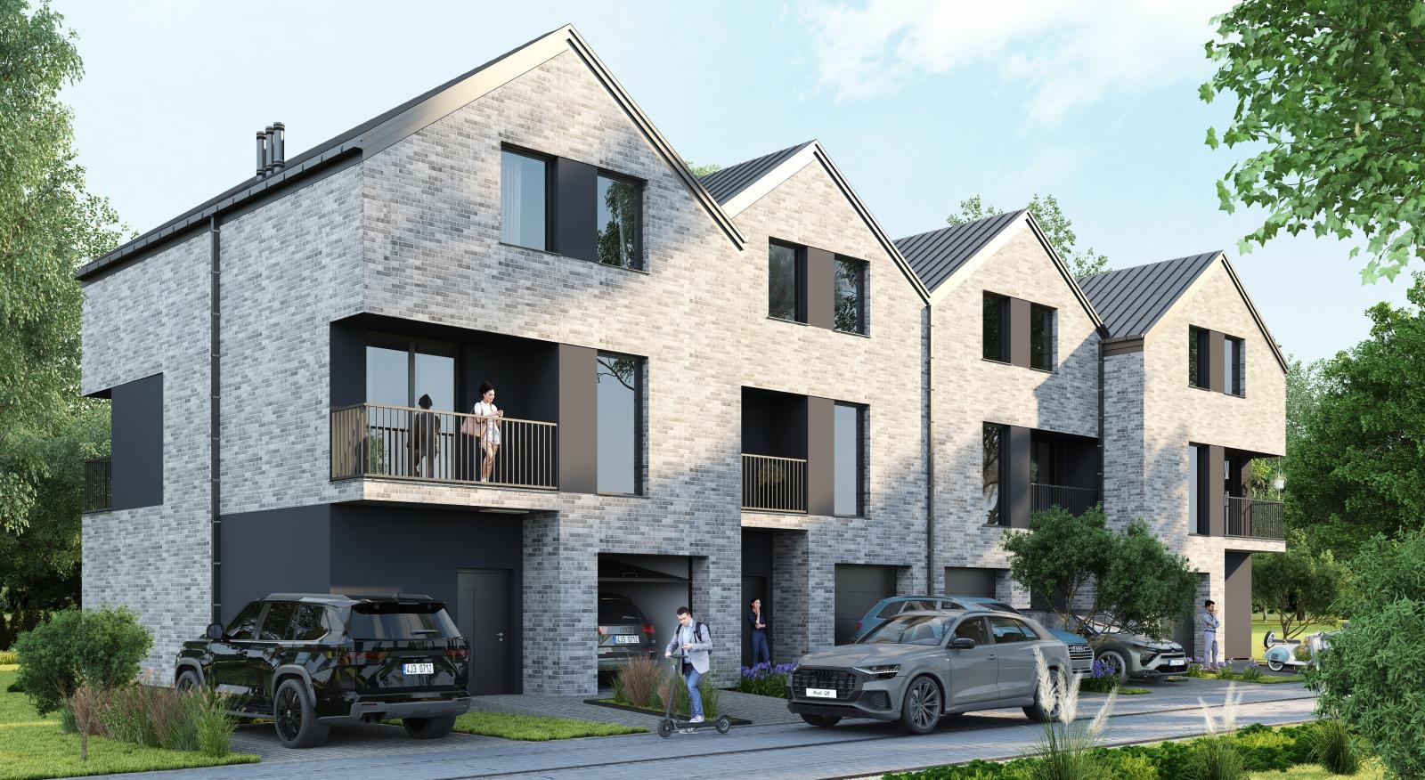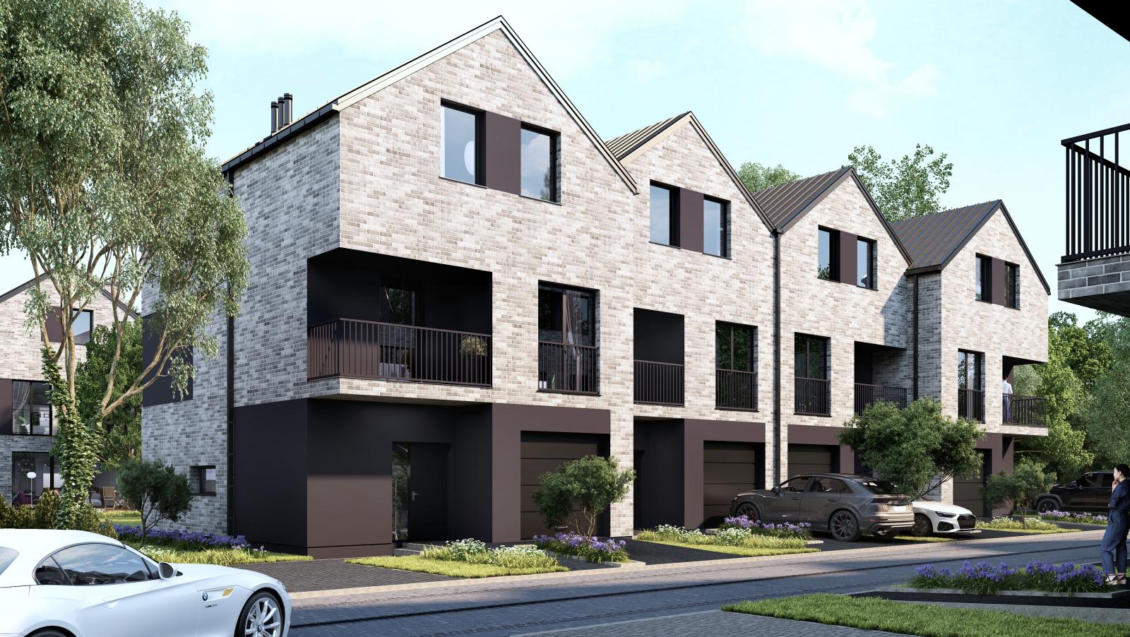 Każdy z trzykondygnacyjnych domów posiada m.in garaż, strefą dzienną o zróżnicowanym nasłonecznieniu, pięknie zaaranżowany ogród.